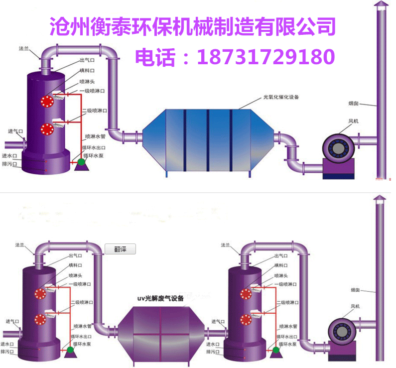 進風管道--進入噴淋塔利用液體水分解吸收有害氣體--出風帽蓋--排風管--光氧催化廢氣凈化器分解噴漆廢氣--風機煙囪排出干凈的空氣。噴淋塔采用物理液體吸收有害氣體和蒸氣時純物理溶解過程。在水中溶解有害氣體和蒸氣,由風管進入光氧廢氣凈化器中凈化廢氣,最后由風機排入大氣中。